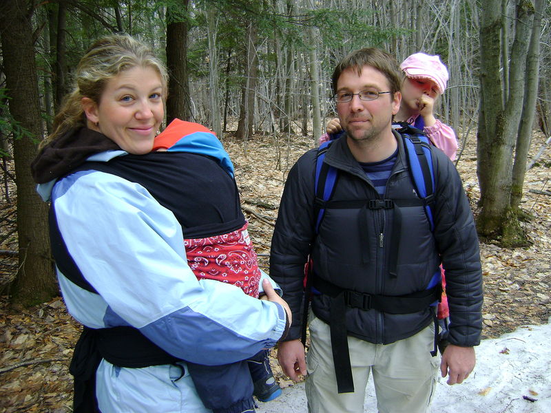 Nous avons marché pendant près d'une heure trente avant qu'Olivier, qui trônait fièrement dans le sac dorsal sur Papou, ne montre un signe de fatigue. Je l'ai donc pris dans l'écharpe et, tout collé à moi, il a fait une micro-sieste de 30 minutes, juste avant que nous atteignions le sommet. Nous avons même croisé un super gros barrage de castors! C'était vraiment impressionnant de voir tous ces arbres rongés et placés sur le lac!
